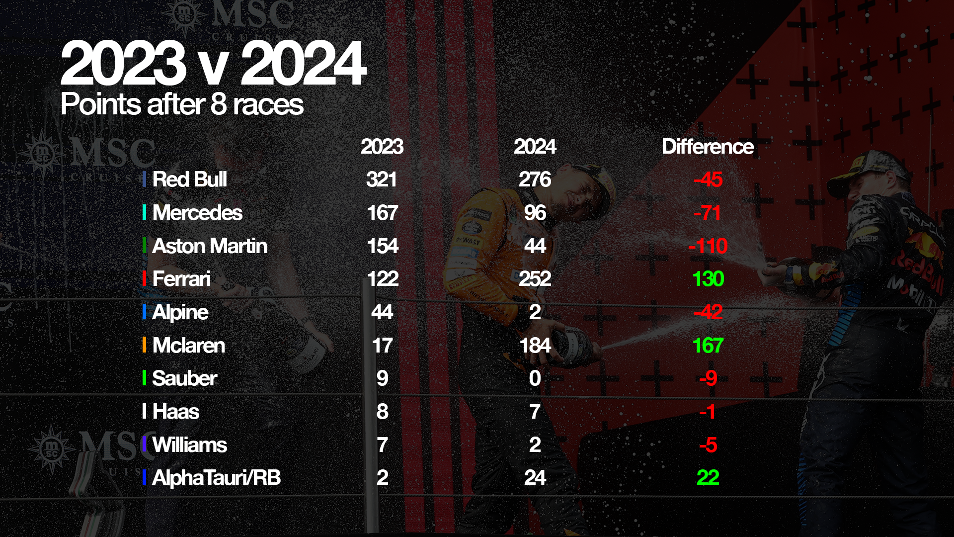 Ferrari is just lacking that final edge of pace to challenge Red Bull consistently. But while its average single-lap performance is fractionally worse than last year, it’s now in an all-round better place - as proven by it having 130 points more than at the same stage in 2023.
