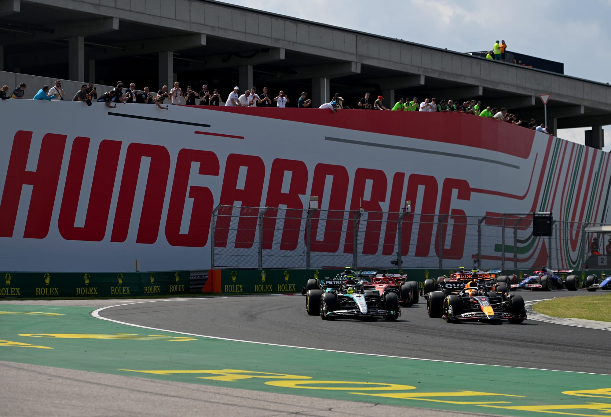 It was a similar story up to the second stops: Hamilton (and Leclerc) in early, Verstappen staying out nine laps longer, coming out behind them and launching an attack. One which initially got him past Leclerc but which took him into flight after contact with Hamilton after he locked up and they interlocked wheels. Leclerc repassed as Verstappen was rejoining. That was how an ill-tempered Max finished fifth on a hot day in Hungary, just ahead of the second Ferrari of Carlos Sainz.