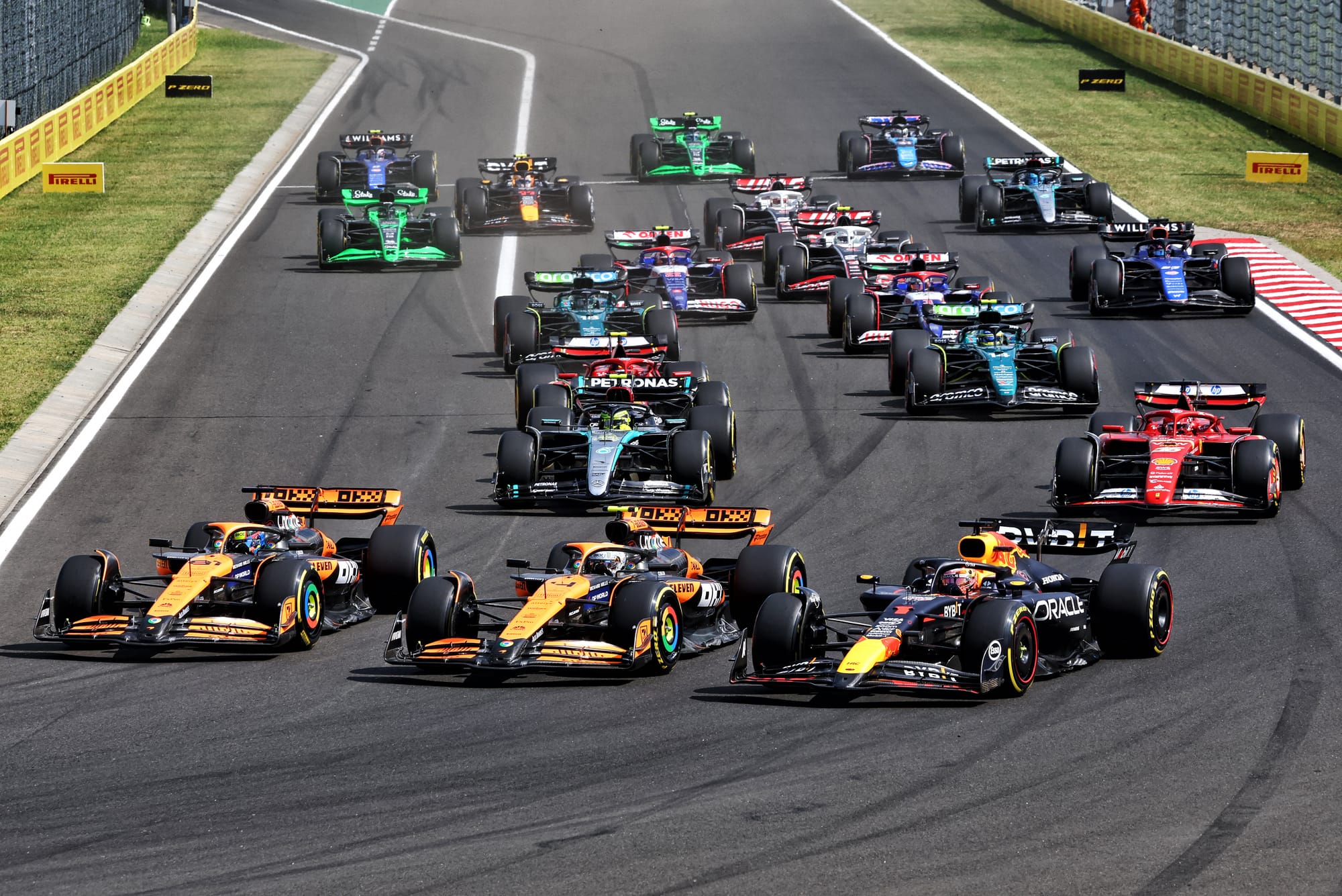 Norris was actually jumped out of Turn 1 by Hamilton too but then as Verstappen ran the Mercedes out wide through the exit of Turn 2, so Norris was able to scramble back ahead - and thus be in place for Verstappen to give the place back a couple of laps later. By the time that was all sorted, Piastri was 2.3s up the road. It looked like that was game set and match for McLaren, 1-2 and pulling away as neither Verstappen nor Hamilton had their pace.