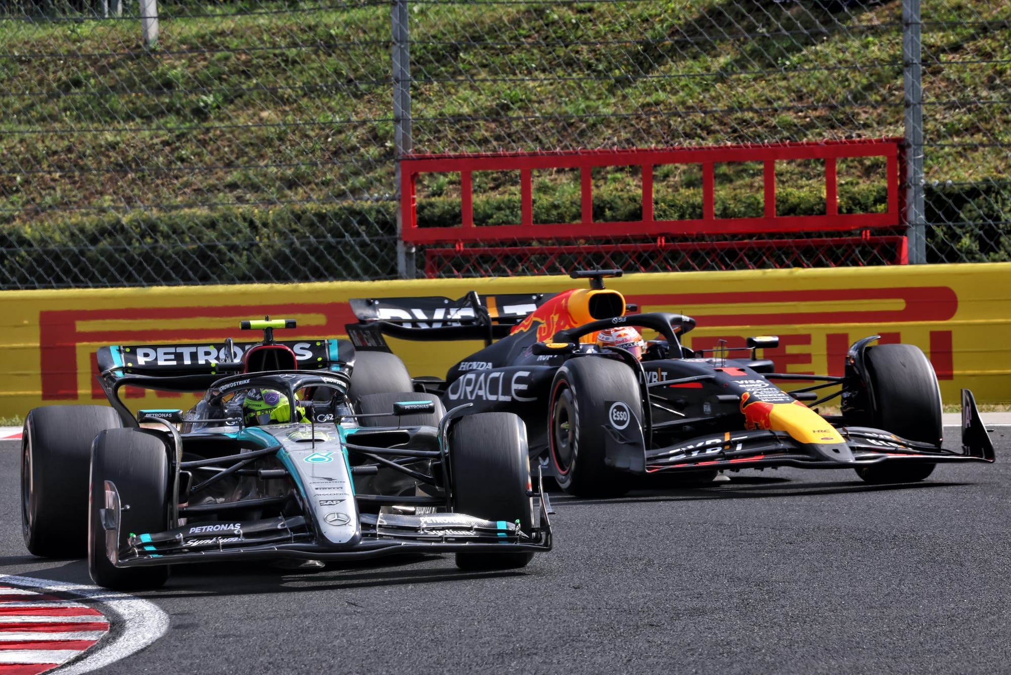 This time, he came back and had the inside line at Turn 1 - but he locked up. As Hamilton turned in, the Mercedes hit the Red Bull’s left-rear tyre and briefly pitched Verstappen airborne.